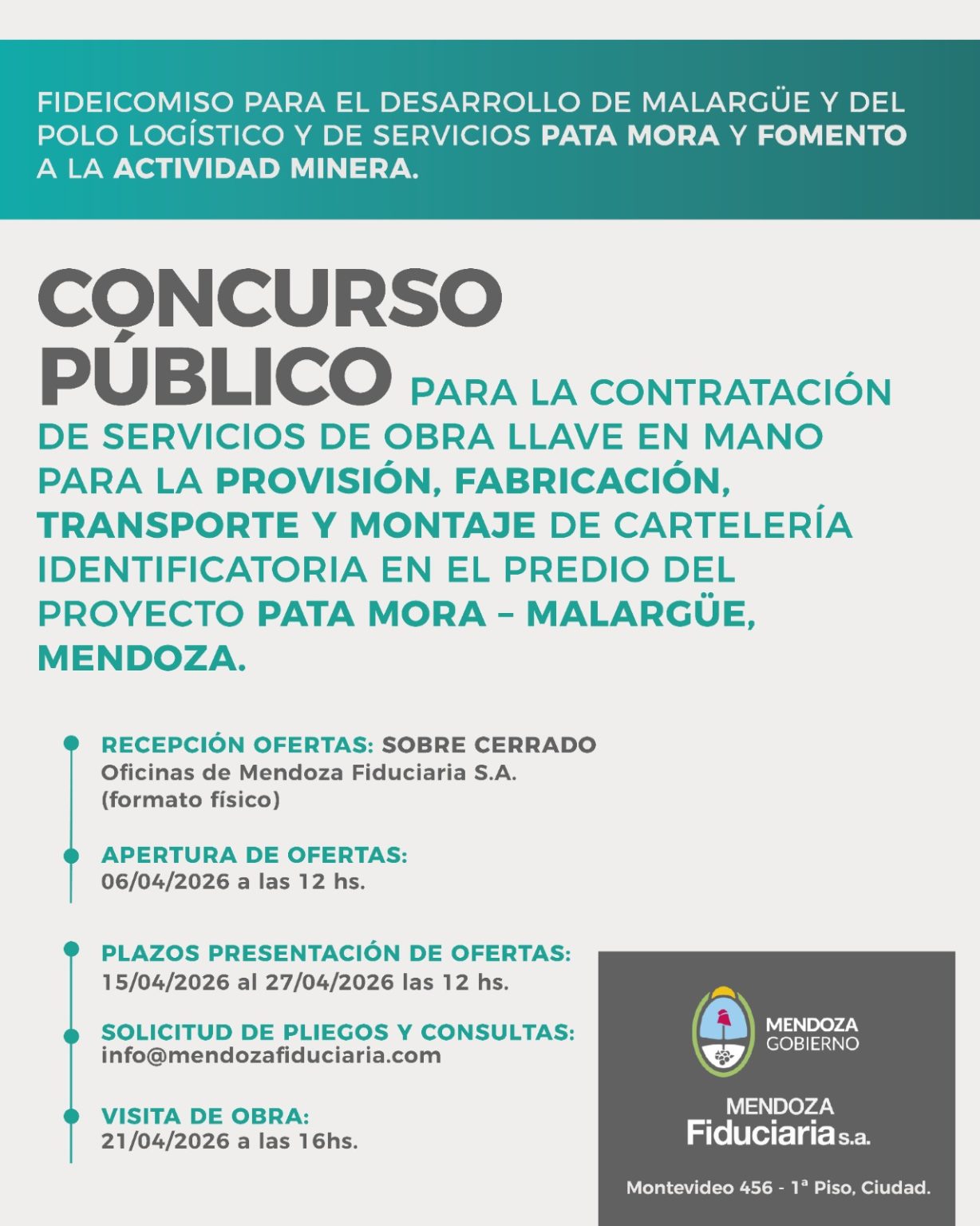 CONTRATACION DE SERVICIOS DE OBRA LLAVE EN MANO PARA LA PROVISIÓN, FABRICACIÓN, TRANSPORTE Y MONTAJE DE CARTELERÍA IDENTIFICATORIA EN EL PREDIO DEL PROYECTO PATA MORA – MALARGÜE, MENDOZA